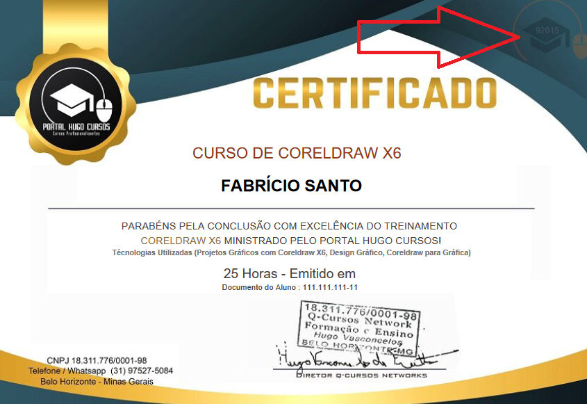 O código será apresentado no canto superior direito do certificado, um número dentro de uma marca d'agua, conforme mostrado na imagem ao lado, basta inserir aqui este número ou usar a url https://www.cursos.mundodeled.com/certificado/codigo.